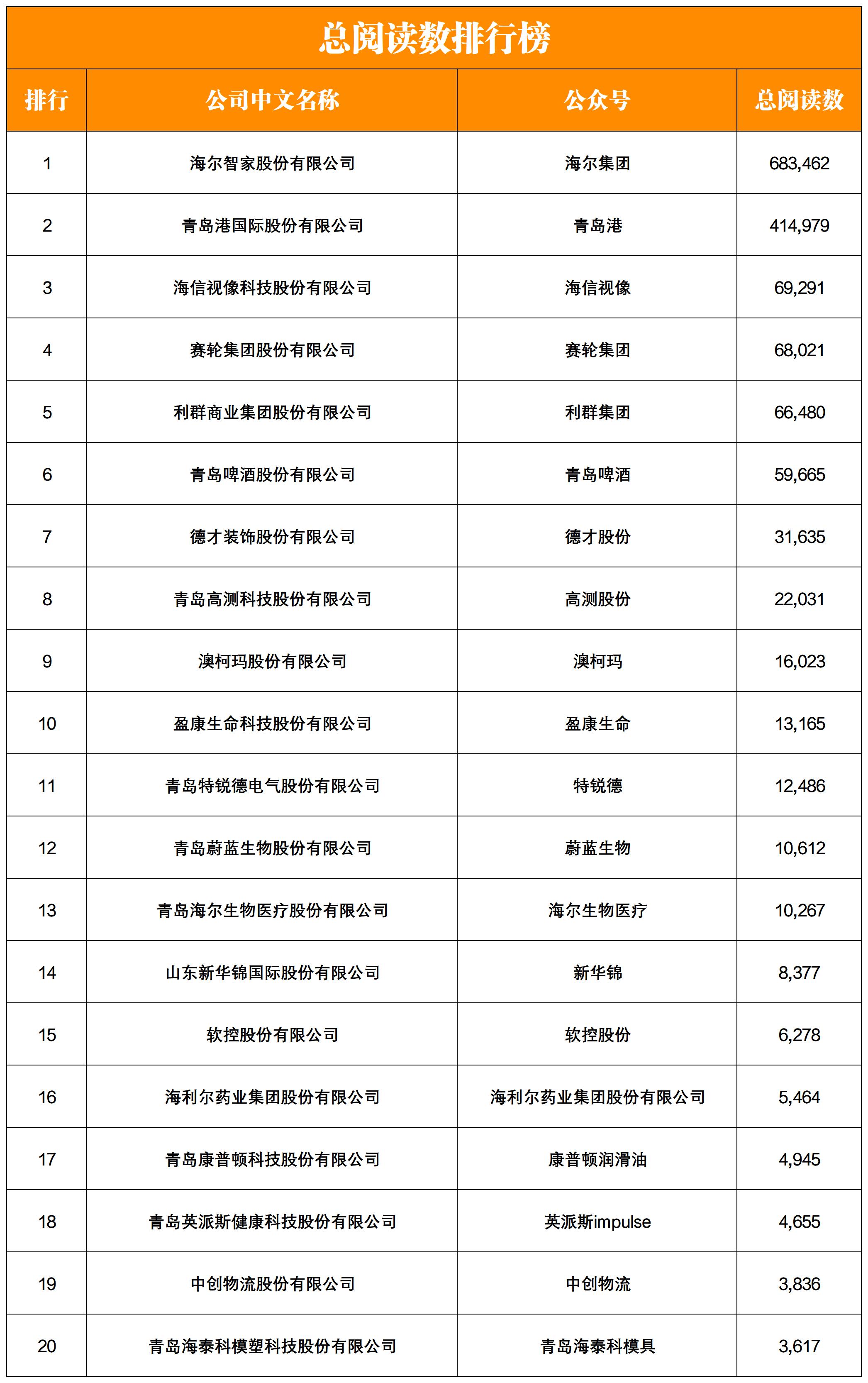 NO.1| 权威发布:青岛上市企业微信影响力月度排行榜TOP20