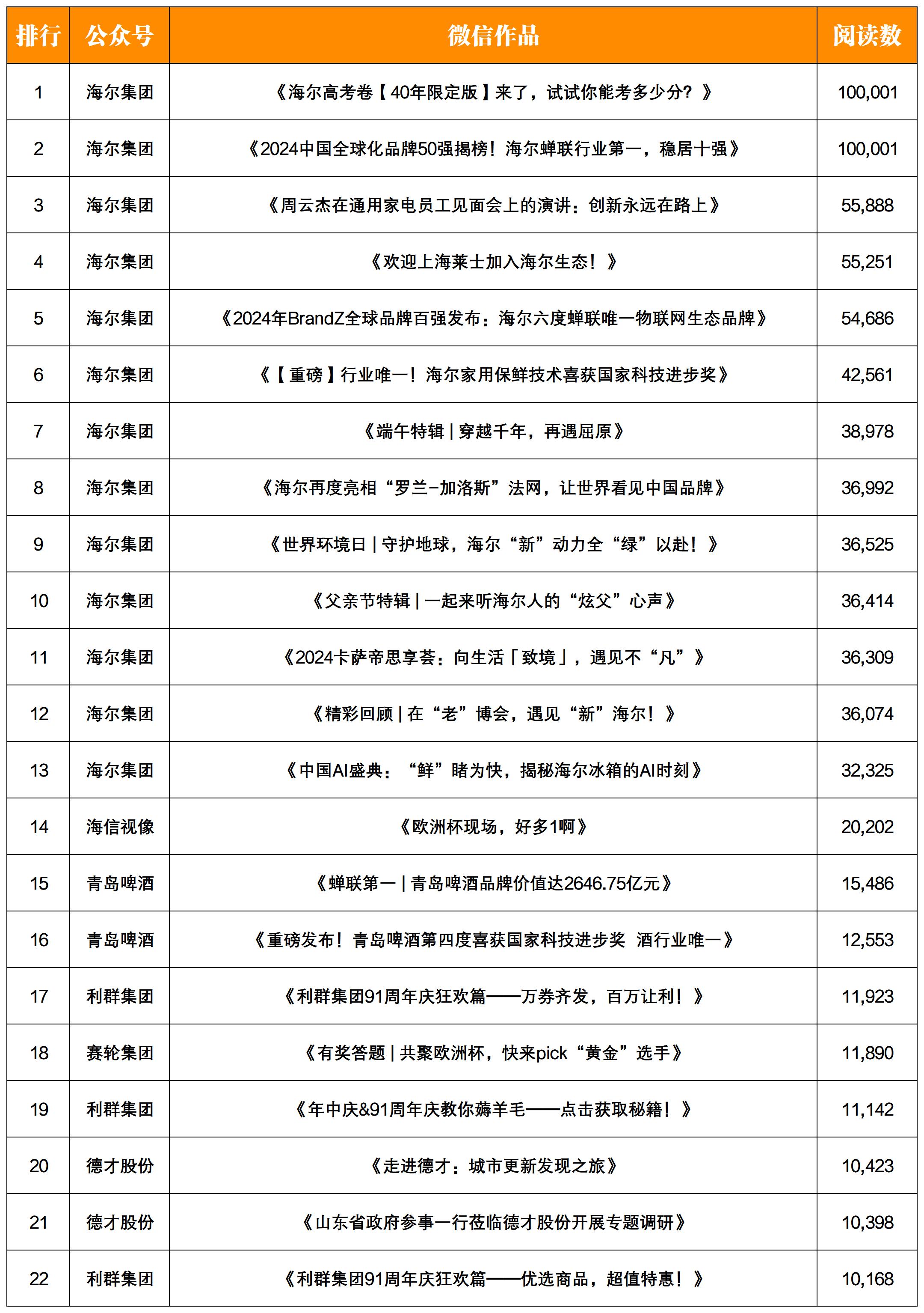 热文方面,“海尔集团”的《海尔高考卷【40年限定版】来了,试试你能考多少分?》和《2024中国全球化品牌50强揭榜!海尔蝉联行业第一,稳居十强》两篇文章均喜提10w+阅读。