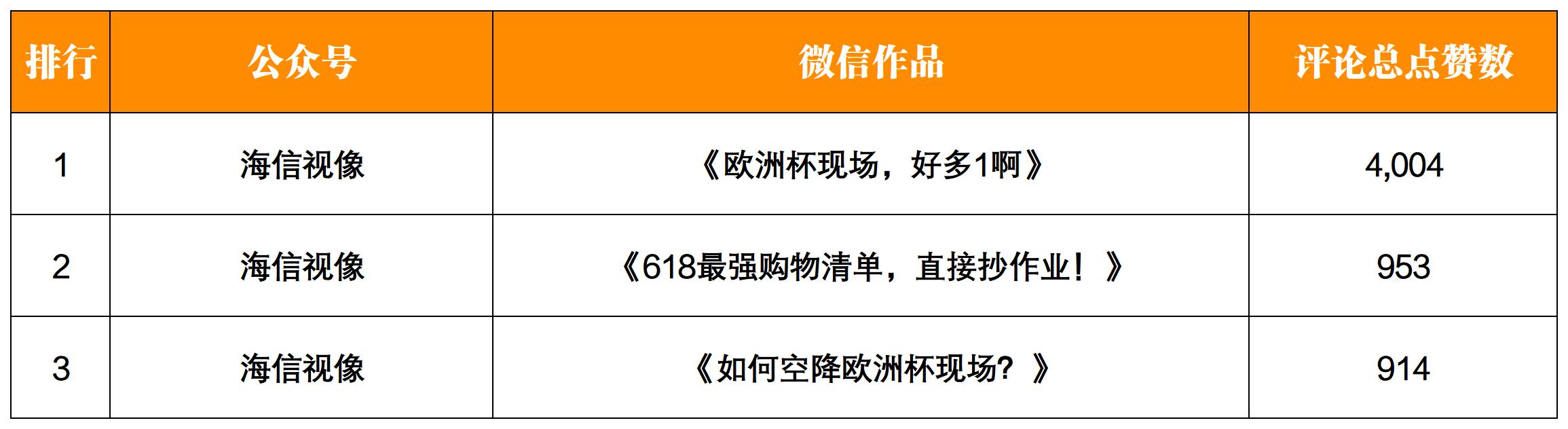 本期单篇作品最高评论总点赞数4004,出自账号“海信视像”的《欧洲杯现场,好多1啊》一文;排行第二、第三也均出自账号“海信视像”的《618最强购物清单,直接抄作业!》一文和《如何空降欧洲杯现场?》一文,评论总点赞数分别是963和914,数据比上一期有所提升。