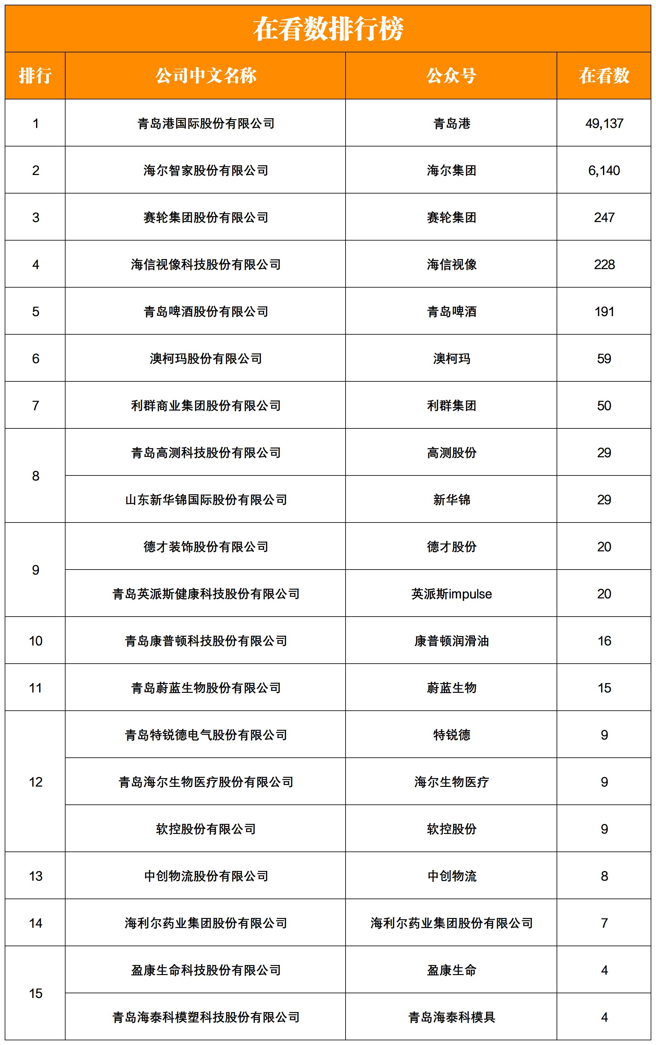 本期登上分榜单总在看数前三的青岛上市企业是:“青岛港”、“海尔集团”、“赛轮集团”。