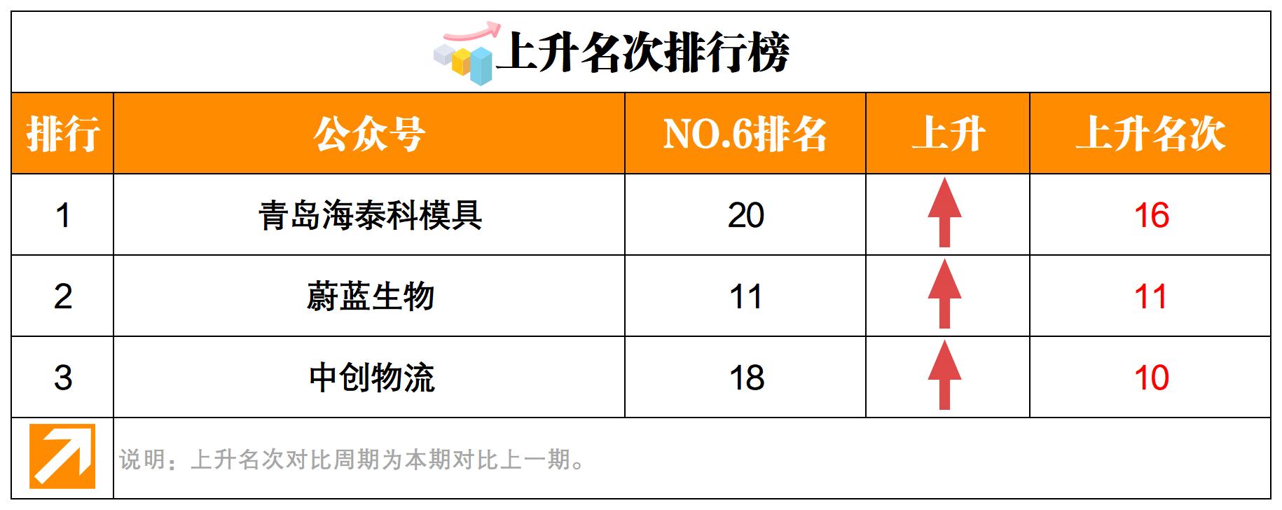 本期上升名次排行榜前三名分别是:“青岛海泰科模具”、“蔚蓝生物”、“中创物流”。