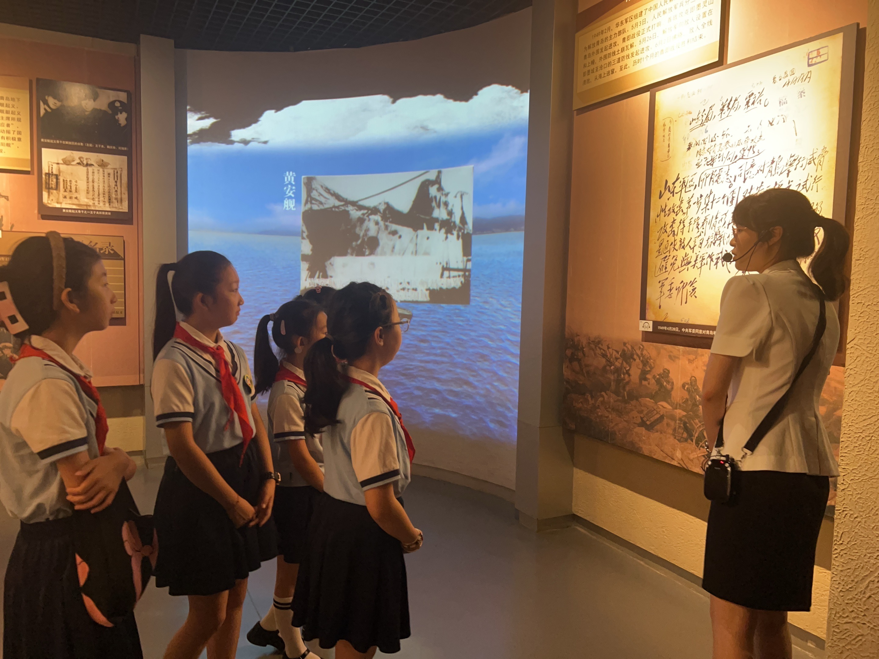 同学们在放映厅观看了青岛的历史沿革,通过五四运动、工人运动、国棉六厂、四方机场等几段珍贵的历史影像,了解自己的家乡是中国共产党发展历程中,革命先烈播撒红色种子的地方,也是先烈们用青春和鲜血换来了今天来之不易的幸福生活。