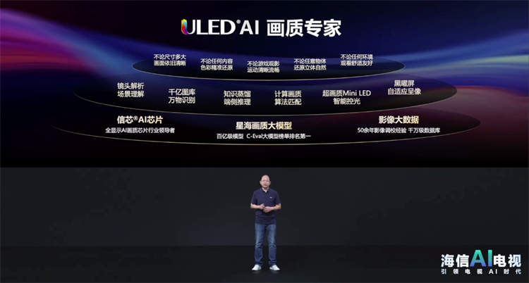 海信此次推出的AI电视新品搭载其独有的ULED AI画质平台,基于海信星海大模型赋能的全新信芯AI画质芯片和庞大影像数据库,通过知识蒸馏、迁移学习等方式,从影响用户观看的环境、内容、视角等全部维度进行AI画质计算及参数匹配,持续赋能端侧专家模型,图像的超解像能力提升一倍,环境光控精细度大幅提升,能够将普通2K画面升级至更清晰的4K,且告别环境光干扰,让用户在任何观看环境和内容下均能享受到超清画质。
