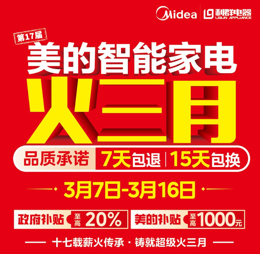 本届青岛美的火三月活动将从3月7日持续至3月16日,惠及全市居民,这种规模的大型活动每年仅举办一次,想为新居配备家电、旧家电以旧换新的居民请抓住机会,买美的来利群,用心服务包您满意!