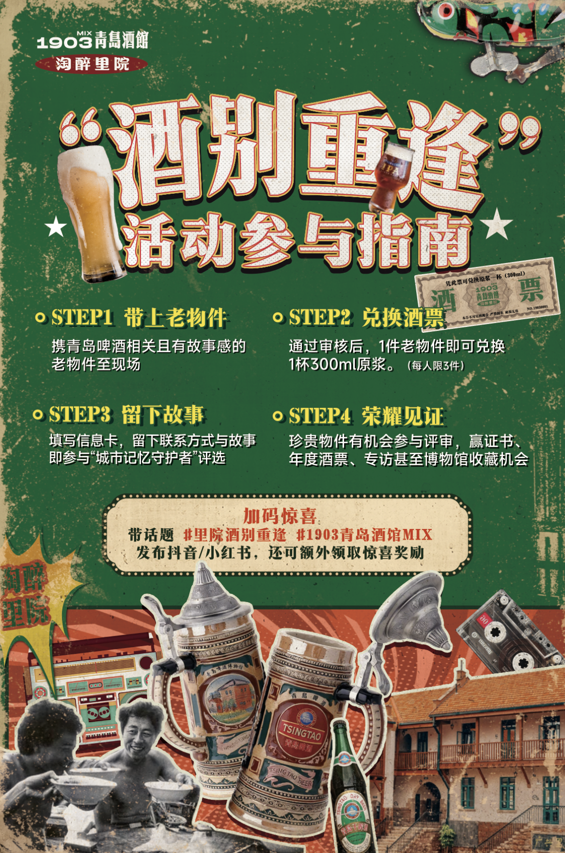 记忆会过期,但故事永远鲜醇。在博山路64号,一座融合历史与时尚的城市文化地标——1903青岛酒馆MIX·淘醉里院,正用一场温暖又怀旧的“酒别重逢”老物件情感兑换活动,唤醒几代青岛人共同的城市记忆。