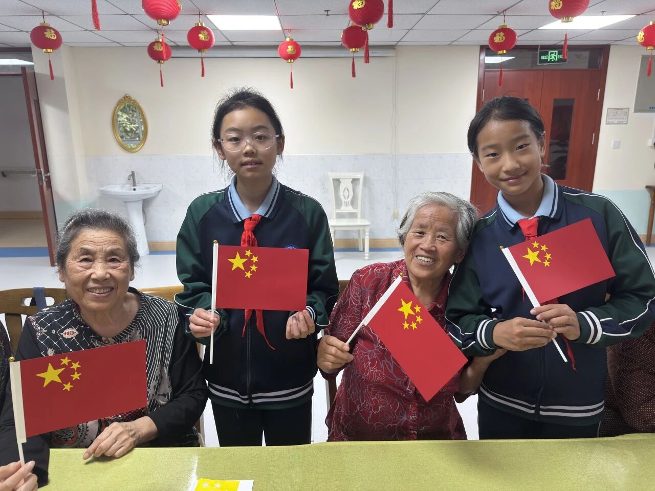 制作完毕,老人与孩子们互相在胸前贴上了小型的五星红旗,把爱国之情互相传递着,现场洋溢着浓厚的祖孙情谊和天伦之乐,也在一面面国旗中展示了老、中、青、少一脉相承的爱国情。最后,大家手持共同制作完成的国旗,合唱《歌唱祖国》。