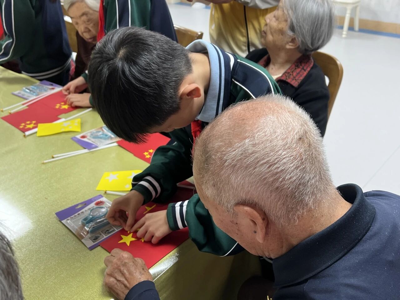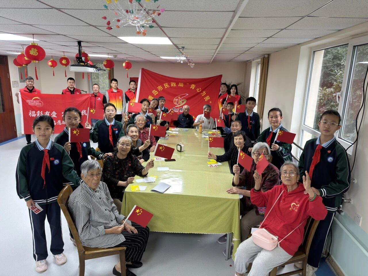 9月28日下午,青岛市民政局“青心为民”青年突击队志愿者与市福彩中心党员志愿者携手,组织深圳路小学学生代表走进青岛福彩养老院青大一路老年公寓,成功举办了一场温馨而有意义的“银发伴童行,共绘爱国情”迎国庆手工制作活动。