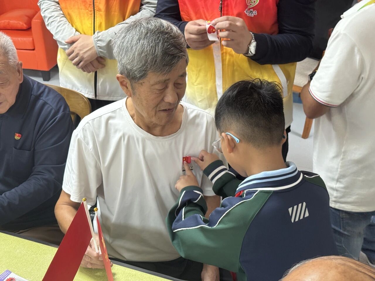 活动伊始,深圳路小学的学生代表国浩乐为在场人员生动讲解了国旗的象征意义。她满怀深情地说:“五星红旗上的大五角星代表中国共产党,四颗小星代表……”专注的讲述,传递着对国旗的尊重与对祖国的朴素情感。老人们听了连连点头。