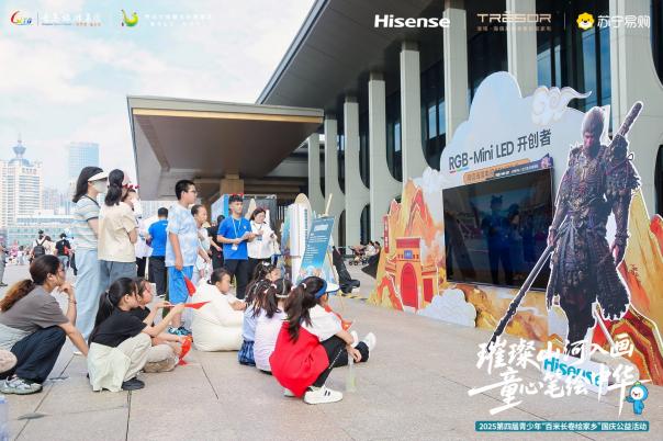 本届活动以“璀璨山河入画童心笔绘中华”为主题,在延续往届集体绘画传统的基础上,创新融入公益售卖、集章打卡、海信璀璨产品趣味互动体验等环节,打造了一场兼具艺术性、公益性与科技趣味性的国庆文化盛宴。