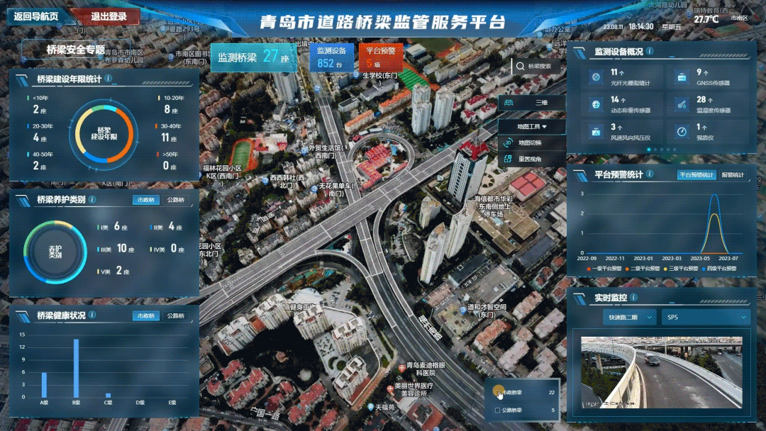 所有感知设备采集的数据,实时回传至青岛市道路桥梁监管服务平台。这个由海纳云打造的“城市桥隧大脑”,融合BIM模型、AI算法与大数据分析,系统自动识别、自动预警,实现“精准溯源、主动防控”。