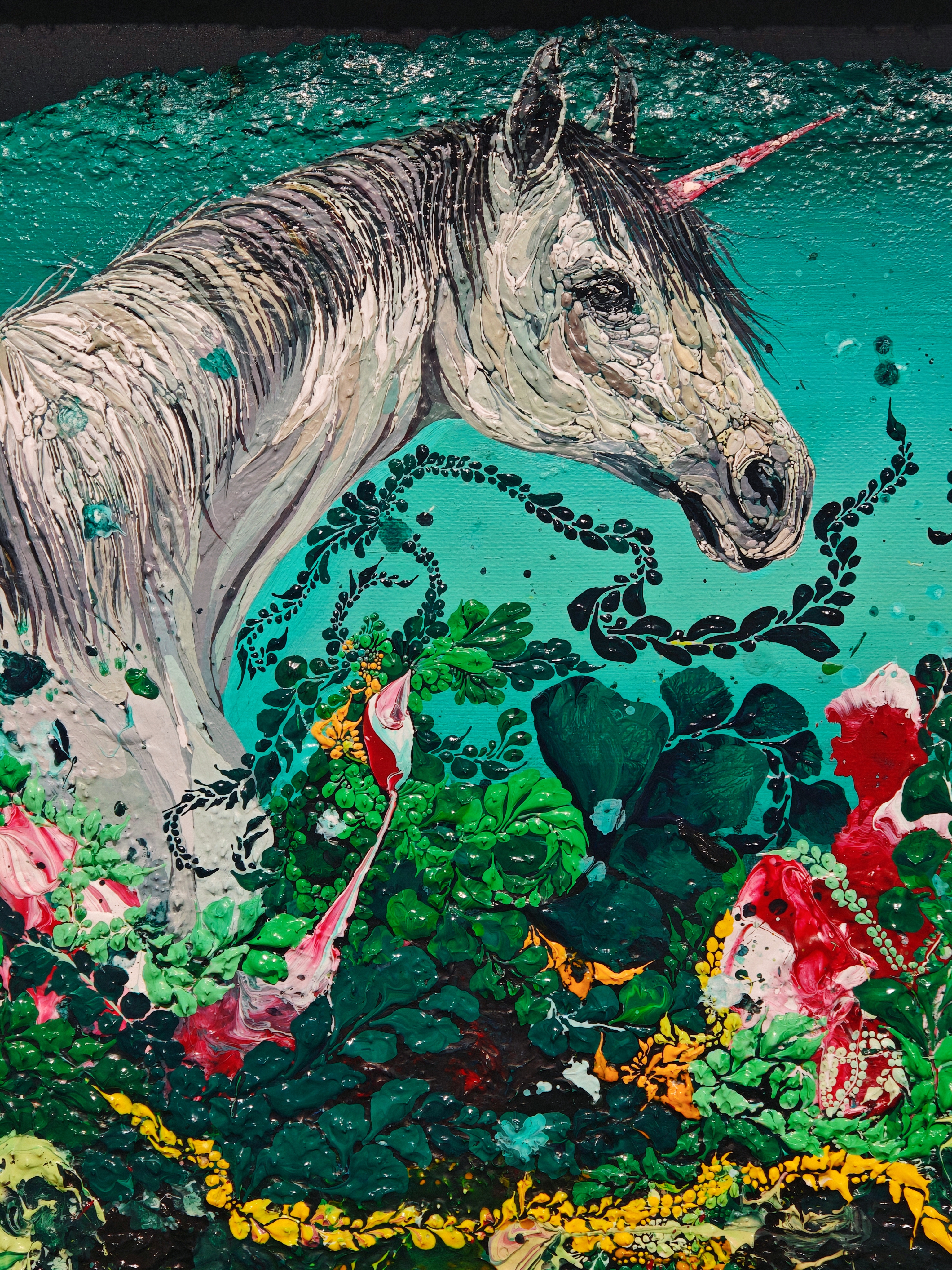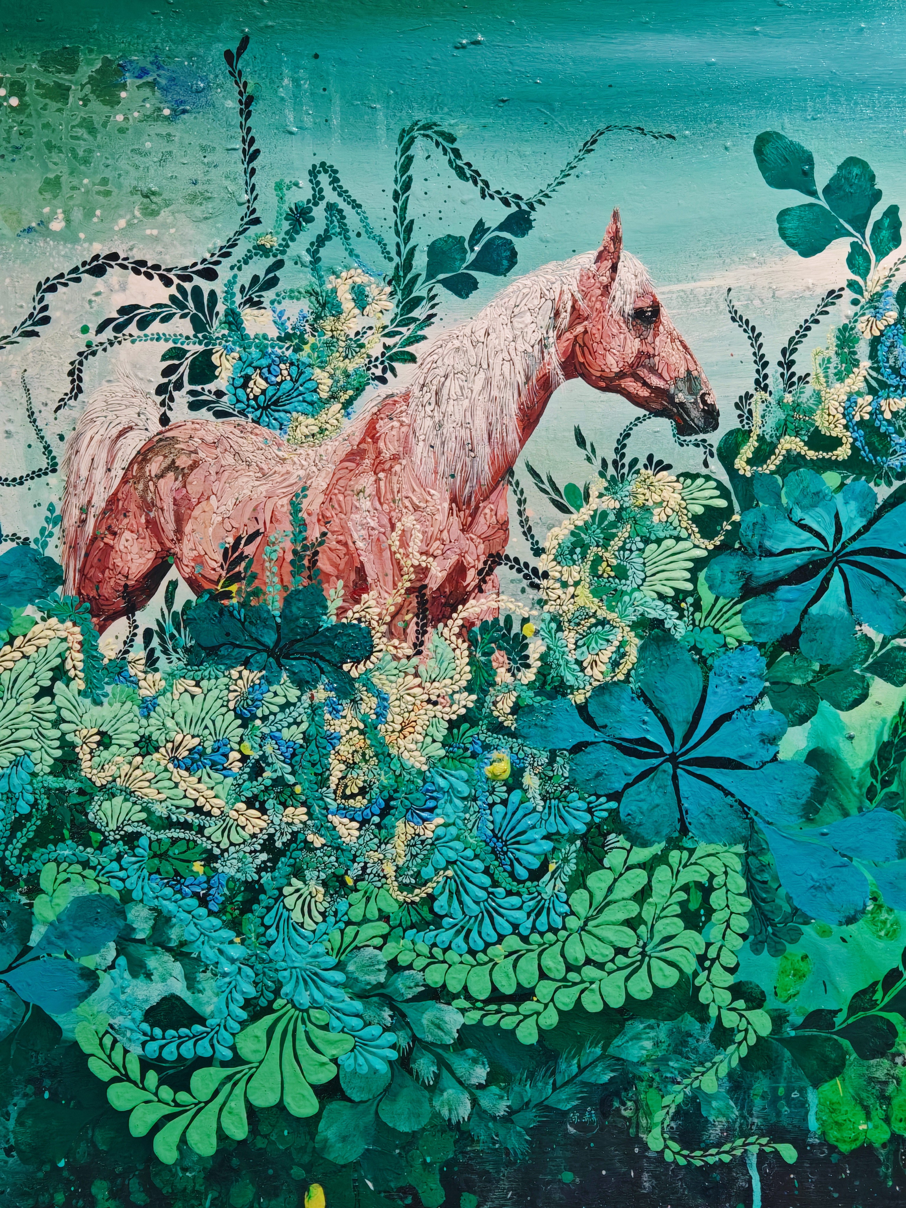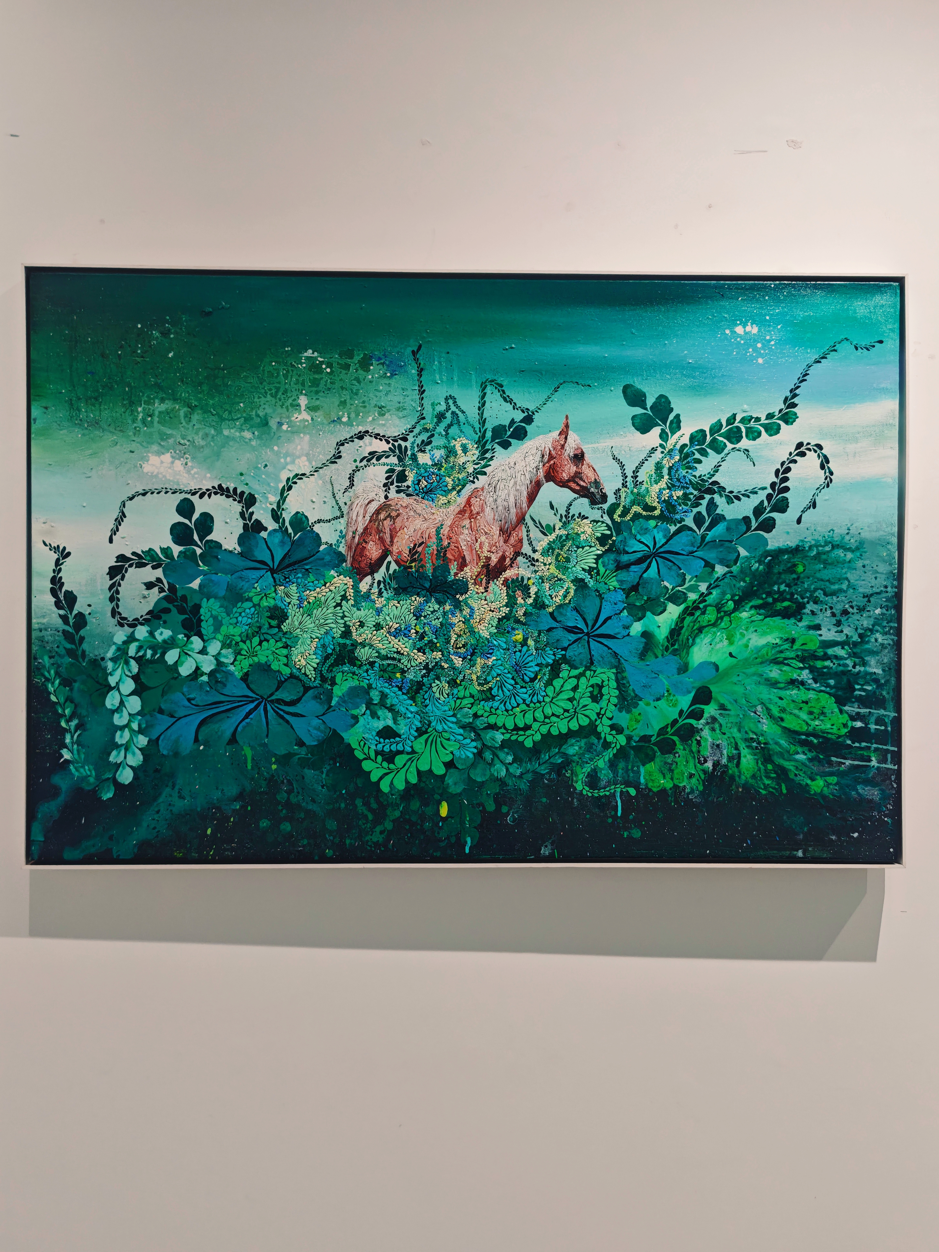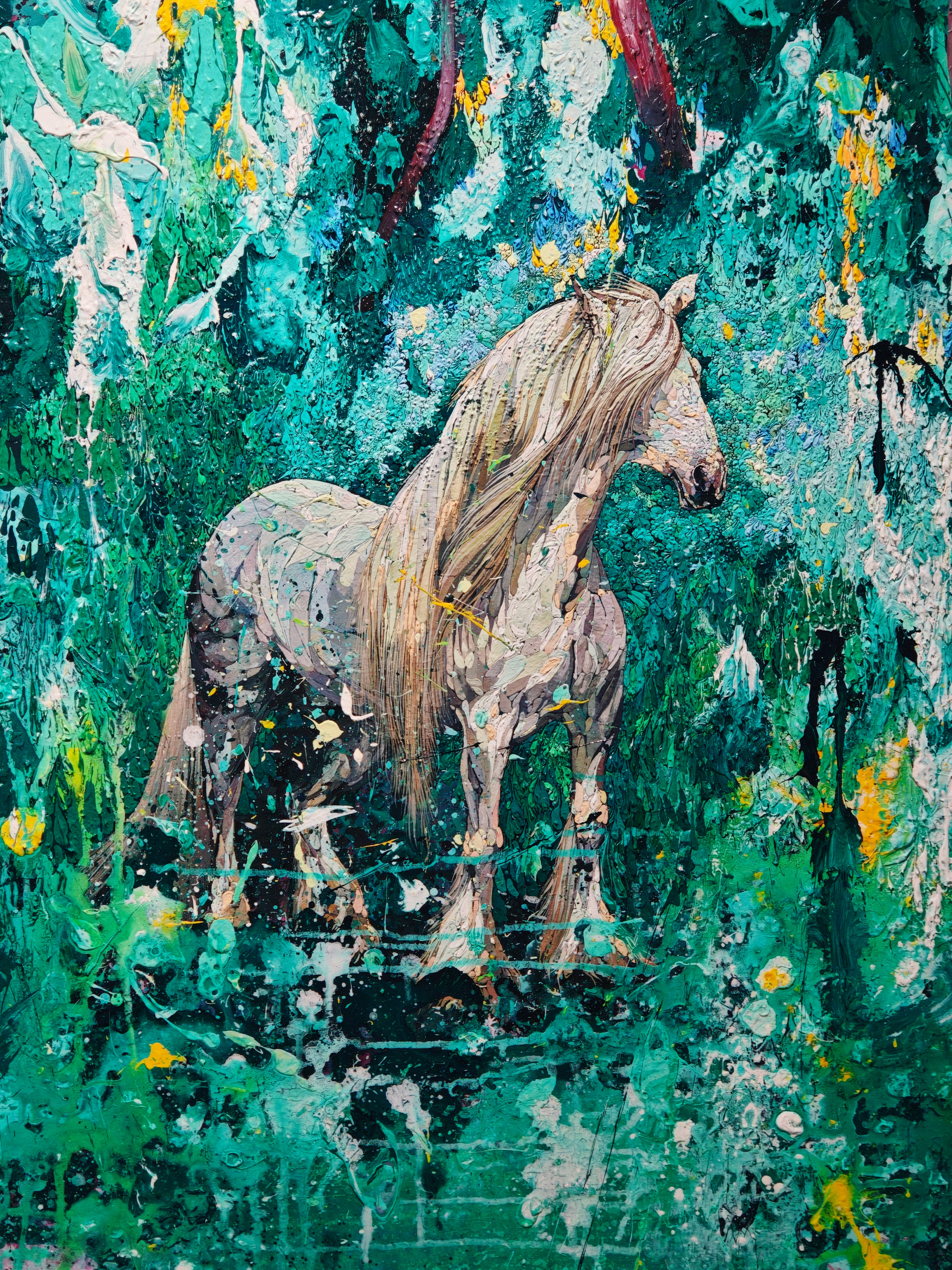 灵性的马匹悠然徜徉在比梦还深的绿意中,层层叠叠的枝叶,是用丙烯精心堆积的童话,浓郁神秘,永不凋零,每一笔都像是在诉说着大自然的秘密。