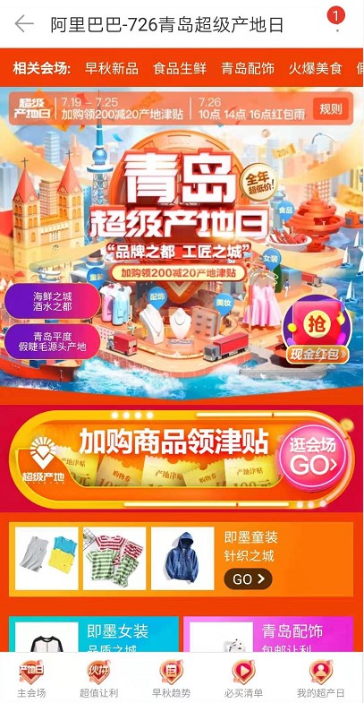 7月26日,“青岛超级产地日”活动将在阿里1688平台上线,精选女装、童装、配饰、美妆工具、食品五大品类,集结近千家青岛产地企业,以“源头价,一手货”将青岛制造优质产品呈现给全世界。