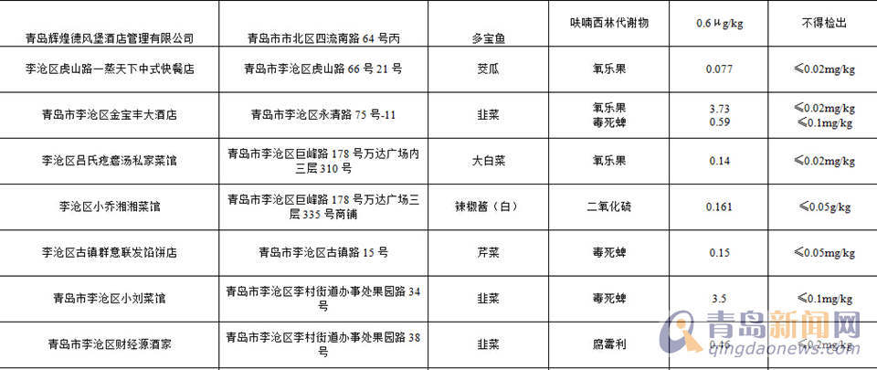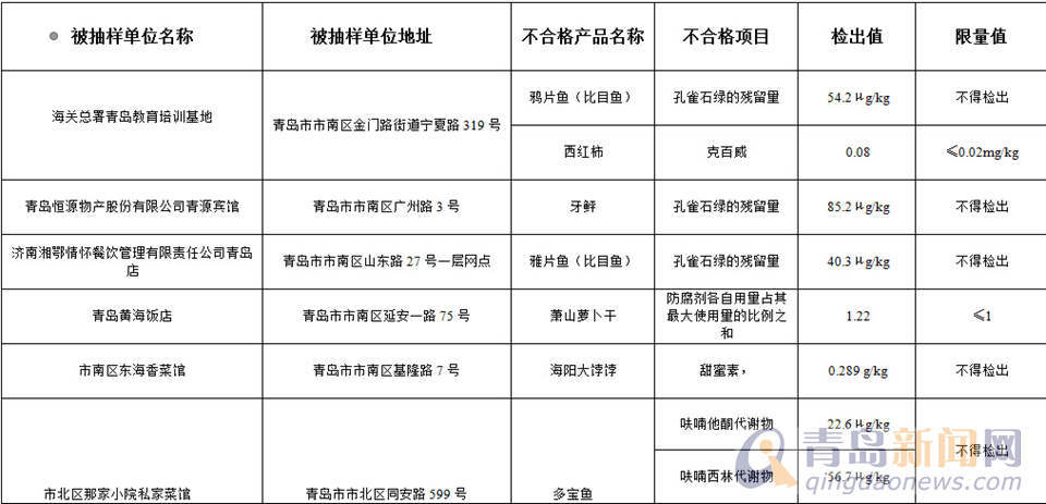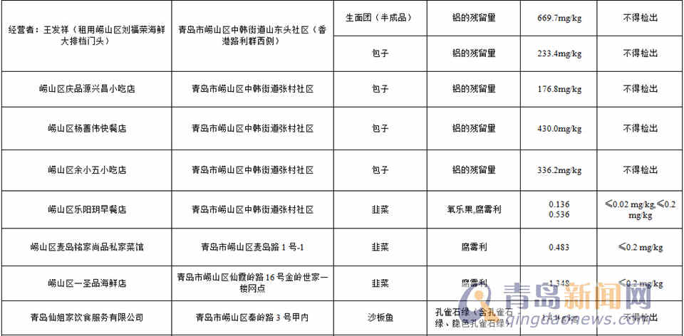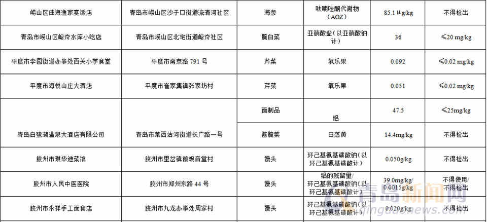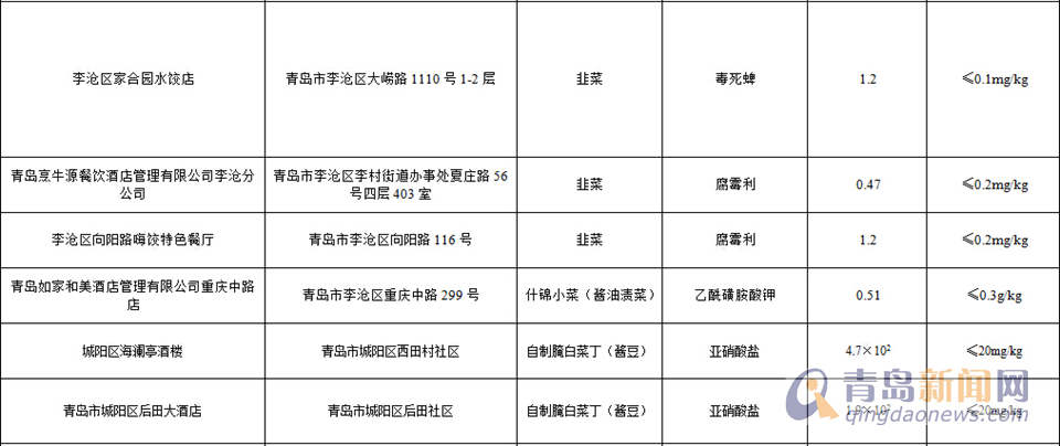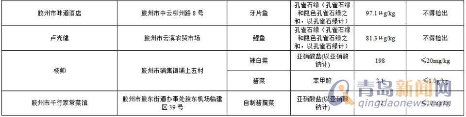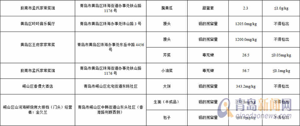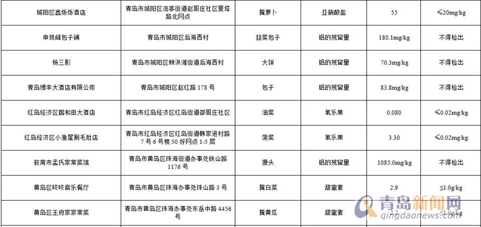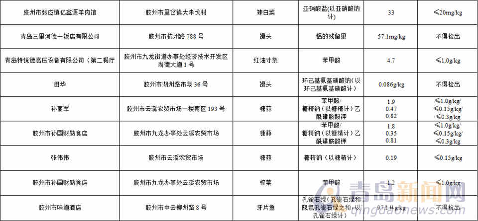 抽检结果显示,四个品种中,蔬菜不合格19批次,不合格项目主要为氧乐果和毒死蜱等农药残留;酱腌菜蔬菜不合格20批次,不合格项目主要为亚硝酸盐和苯甲酸等;馒头等面制品不合格21批次,不合格项目主要为铝残留量和甜蜜素等;水产品不合格9批次,不合格项目为孔雀石绿和呋喃西林代谢物等。