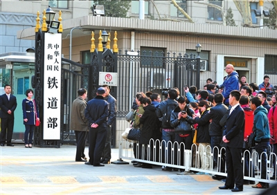 昨天下午,很多市民在铁道部牌匾前合影留念。(记者 陶冉 摄)