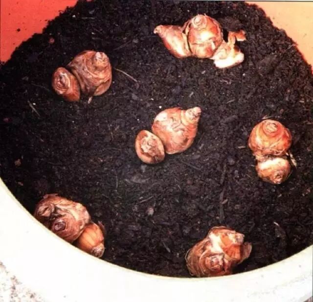 用培育土填满花器(最好使用球茎专用土或是复合型园艺土)一直到离盆15厘米处。如果使用多功能园艺营养土,要混合入一定比例的园艺砾石,砾石和营养土的比例为1:3。