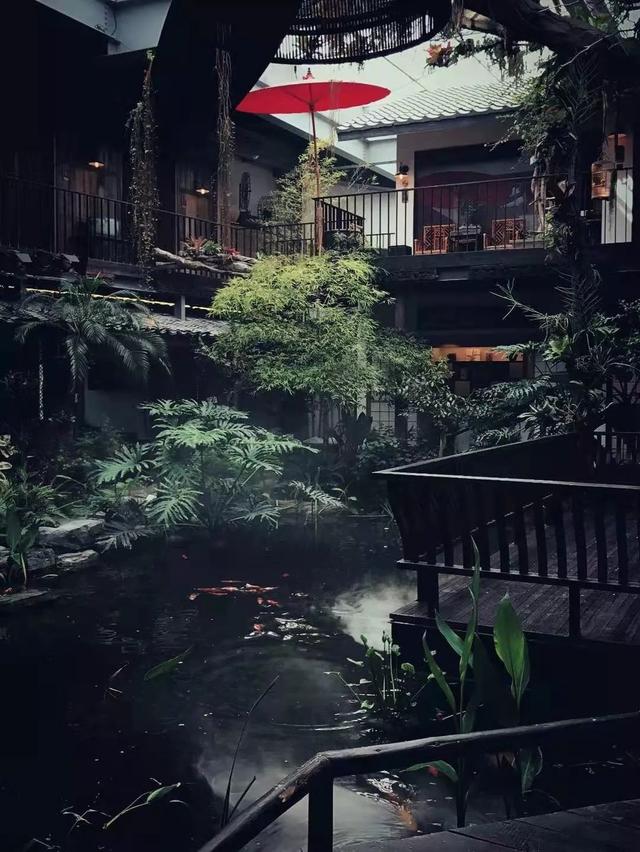 推门入内,映入眼帘的是老树青砖小桥流水,亭台楼阁雕花门窗,满满的古朴静谧感,不知道的以为来到了苏州园林,满目的绿植和古色古香的建筑,很是惊艳。不得不感叹老板的匠心,竟然把这样的景致搬进了商场里。