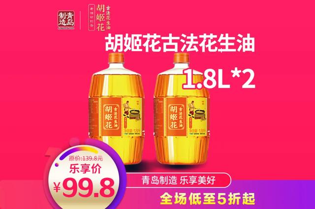 7折抢!胡姬花古法花生油1.8L*2,传承百年古法榨油、家庭常备。