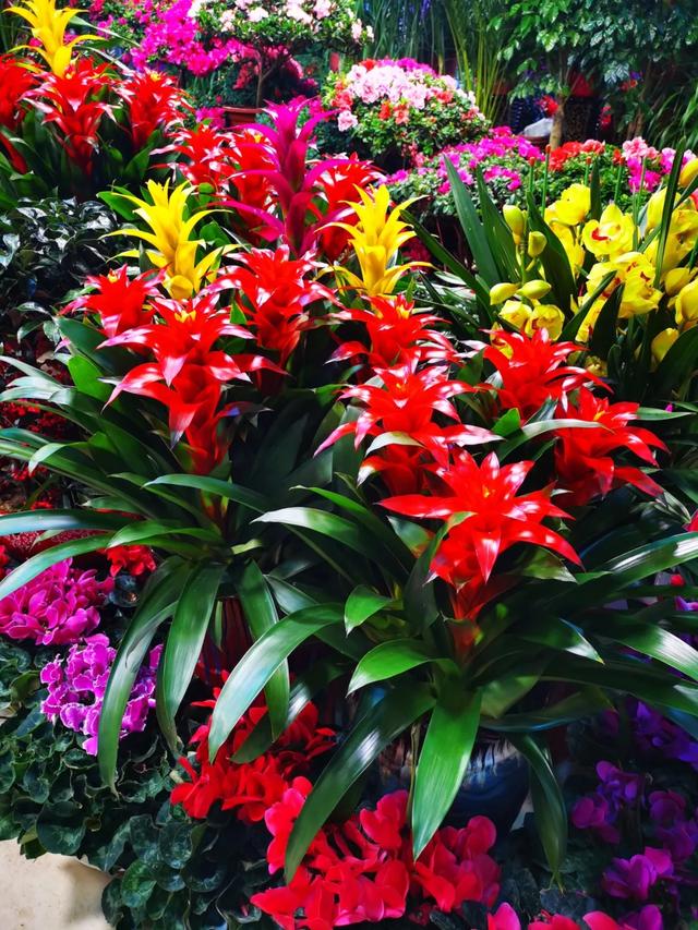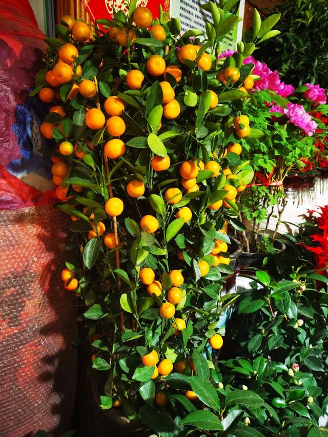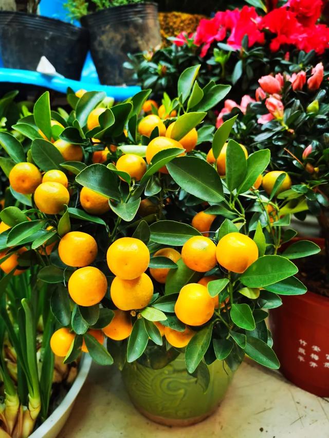 二楼是以盆花绿植为主,常见的蝴蝶兰、凤梨(鸿运当头)、杜鹃花、仙客来、海棠花、柠檬、佛手、小金桔、橘子等等种类齐全,十分丰硕喜庆。