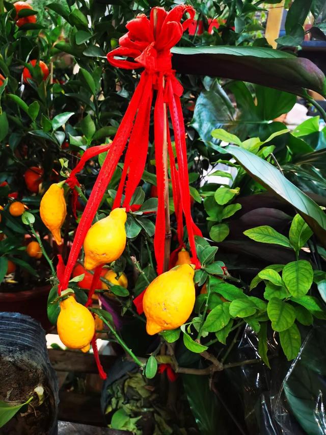 小编在现场了解到柠檬一百元一颗,因为果实比较重,所以用红线拴住,这一树的果实丰硕,看着就喜庆。
