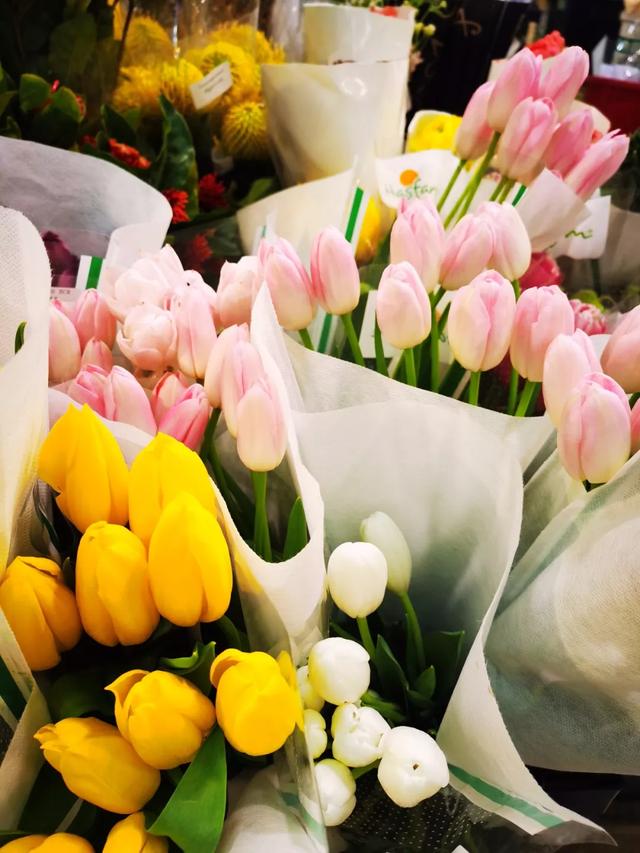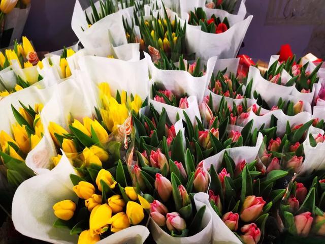 郁金香在众多的鲜切花中,美的十分低调独特。它是优良的切花品种,花卉刚劲挺拔,叶色素雅秀丽,荷花似的花朵端庄动人,惹人喜爱。小编在现场了解到郁金香30元一捧。
