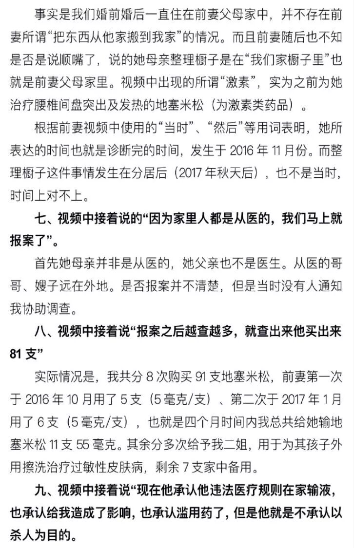 该回应文章称,自己从未在前妻(刘畅)饮用的牛奶和水里下毒,一家人饮用的是同样的水源。在发现身体异常后,每次去医院检查,高瑞森都陪同她,并且向医生反映了曾使用激素类药物地塞米松的情况。而刘畅母亲所发现的大量激素类药物,实际上是存放于前妻父母家中,因为两人婚后一直居住于前妻父母家中。