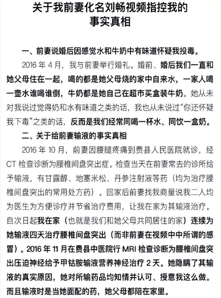 2019年7月13日,山东费县女子刘畅(化名)爆料,2016年10月期间,自己被丈夫大量注射激素,怀疑他投毒谋杀。