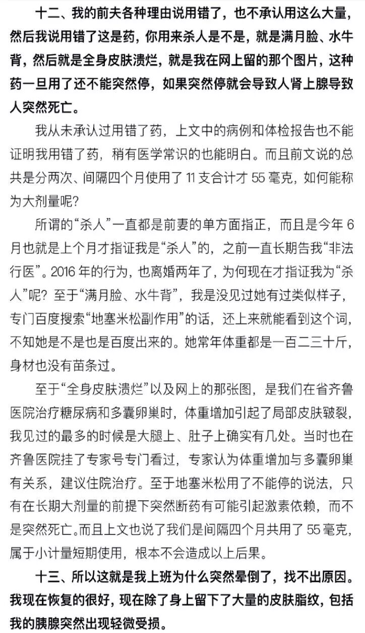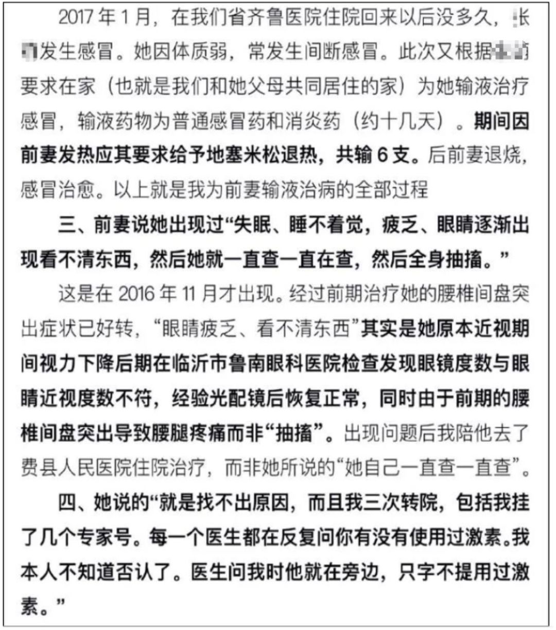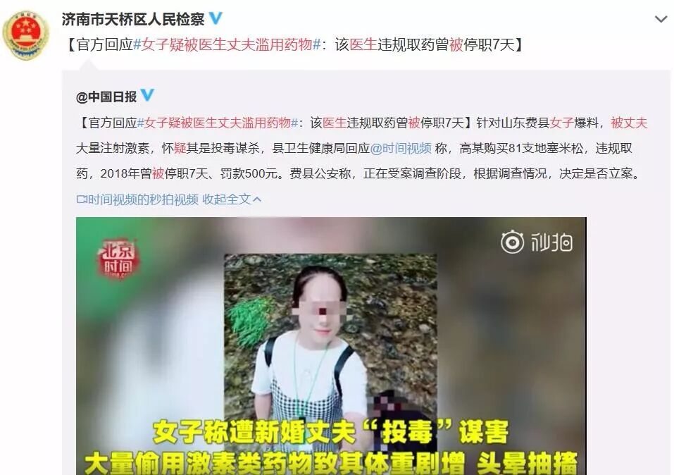 山东一女子日前爆料自己感冒后被医生丈夫注射大量激素,疑遭其慢性谋杀。现在丈夫已成前夫,官方、男方回应接踵而至,事情却有“反转”迹象。