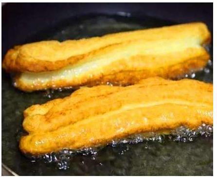 第四步,两个宽条每两块叠加在一起,用筷子在中间轻轻一按,两块黏在一起后,轻轻的拉成长条就下锅炸就可以。起锅烧油7成热,下锅不停地翻动,炸上3分钟左右就可以,油条膨胀,颜色金光,捞出来控油就可以吃了。油条香浓好吃,奶香味夹杂酥脆的油条就做好了。