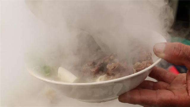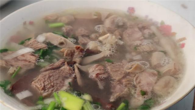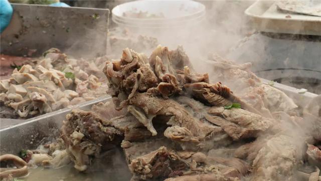 人气最高的当属羊汤摊子,露天操作支起一口硕大的铁锅烹煮。大块的羊肉、羊杂在汤底翻滚,现切现卖,寻着炊烟就能轻松找到~