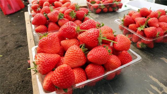 摆满苹果的车子2.5元/斤,红灿灿的草莓15元/斤颗颗饱满,堆得似小山。来往的人群都忍不住上前挑拣几番!
