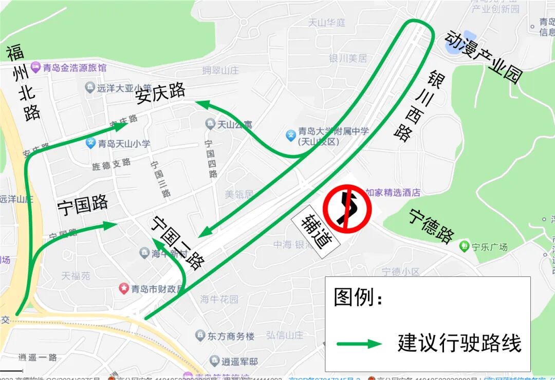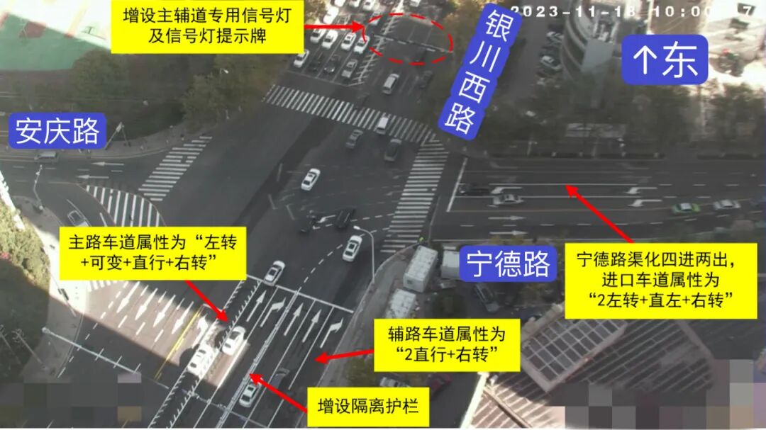 路口交通组织实施后,银川路安庆路路口西向东方向外侧辅路保持禁止左转安庆路的措施。途经车辆可由宁夏路-福州路-安庆路,银川路-宁国二路-宁国路-安庆路或经银川路动漫园路口掉头行驶。