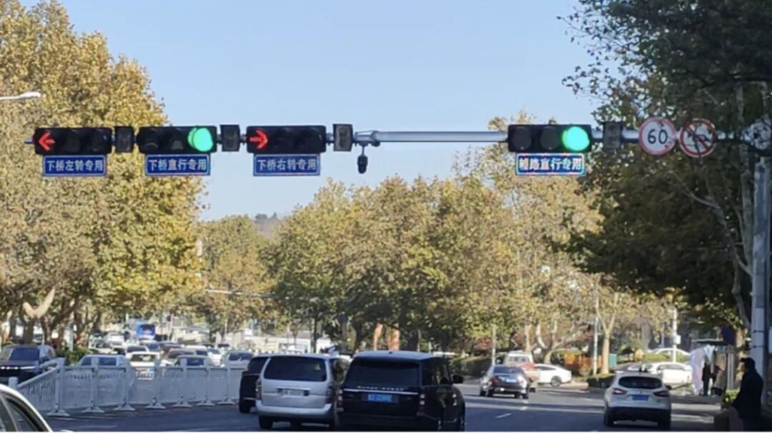 银川西路南进口增设主辅道隔离护栏,主路渠化四车道,车道属性为“左转+可变+直行+右转”,辅路渠化三车道,车道属性为“2直行+右转”,辅路车辆禁止左转;增设主辅道专用信号灯及信号灯指示牌。