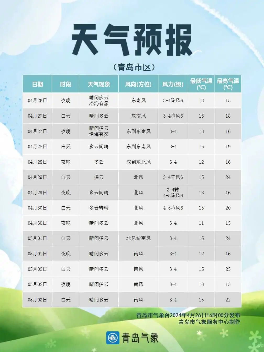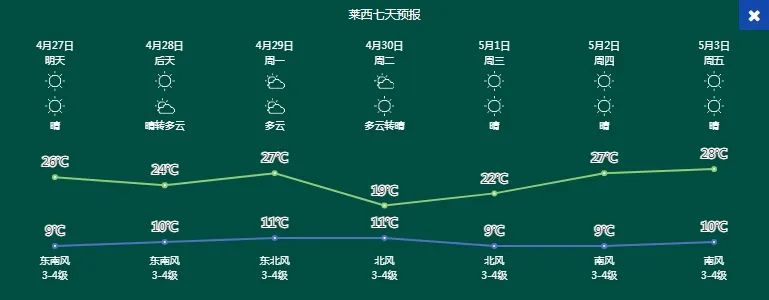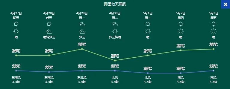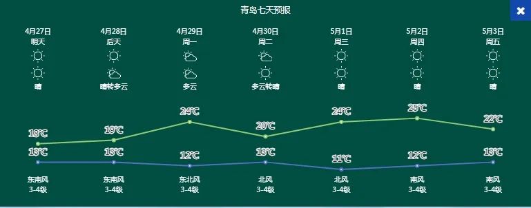 未来一周,各区市最低气温变化平稳,最高气温起伏波动较大,下周一(29日)最高气温上升明显,市区24℃,内陆地区26~29℃,热意冒头;紧接着30日最高气温又明显下降,其中胶州的最高气温由29日的28℃,下降到30日的18℃,降幅10℃;在这之后,各区市的最高气温又将走起回升路。