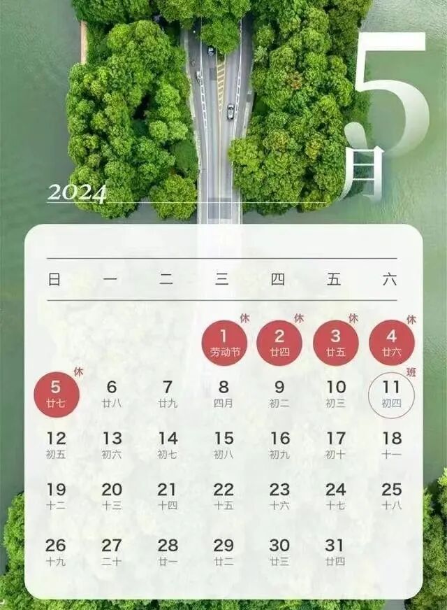 根据《国务院办公厅关于2024年部分节假日安排的通知》精神,2024年“五一”国际劳动节放假安排为:5月1日(星期三)至5月5日(星期日)放假调休,共5天。4月28日(星期日)、5月11日(星期六)上班。