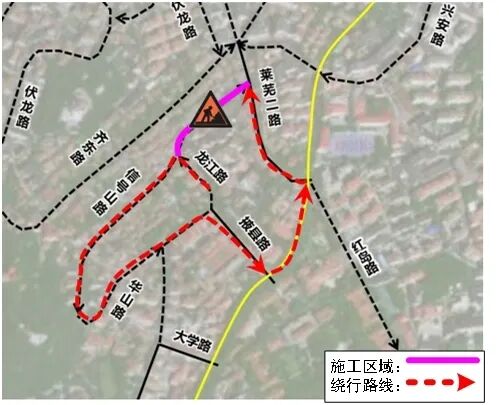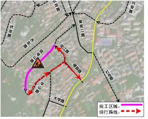 施工路段2位于信号山路(龙江路-华山路)路段,现状为北向南单行,施工管道位于道路中部,需对车行道进行全封闭施工,施工长约250米。施工期间华山路(信号山路-龙江路)路段调整为单车道双行,华山路两端增设交通安全引导人员,引导车辆有序错车,车辆可通过华山路-龙江路进行绕行。