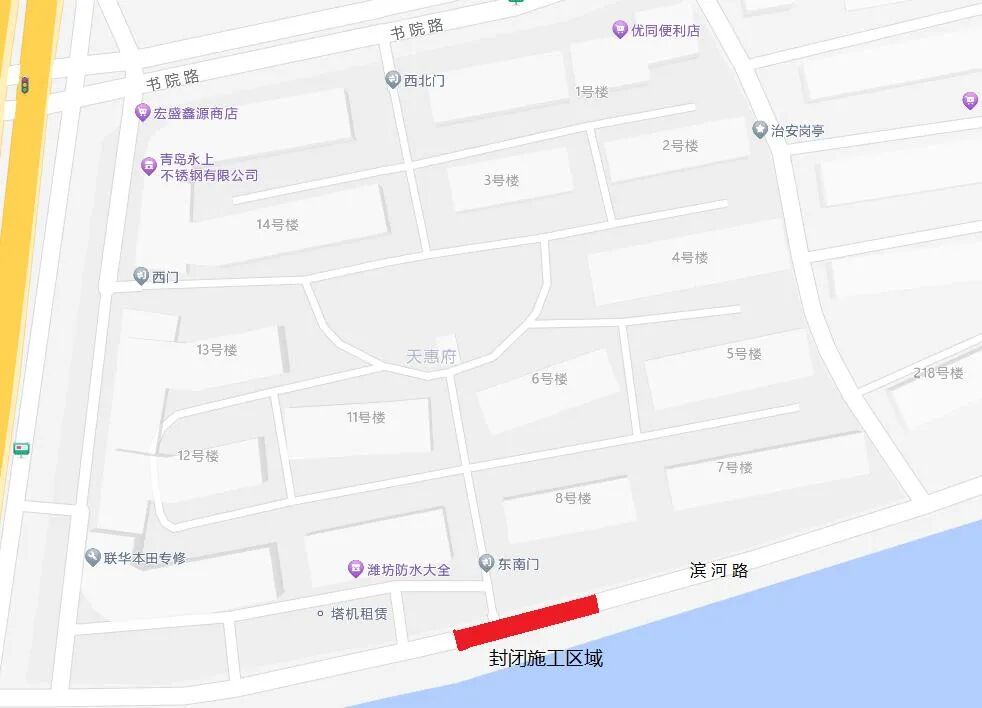 因李沧区滨河路天惠府小区门前路段暗渠局部塌陷,道路存在安全隐患,已不具备通行条件,自即日起至2024年6月26日,对滨河路天惠府小区南门处东西向约30米的路段进行封闭抢修,期间小区南门无法进出车辆,请过往车辆注意提前绕行。