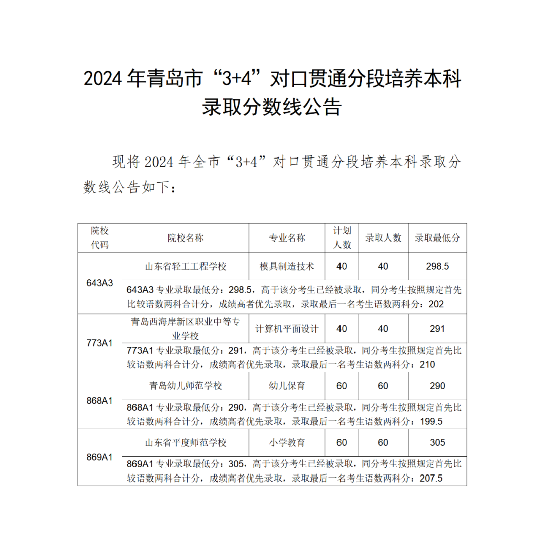 2024年青岛市“3+4”对口贯通分段培养本科录取分数线公告