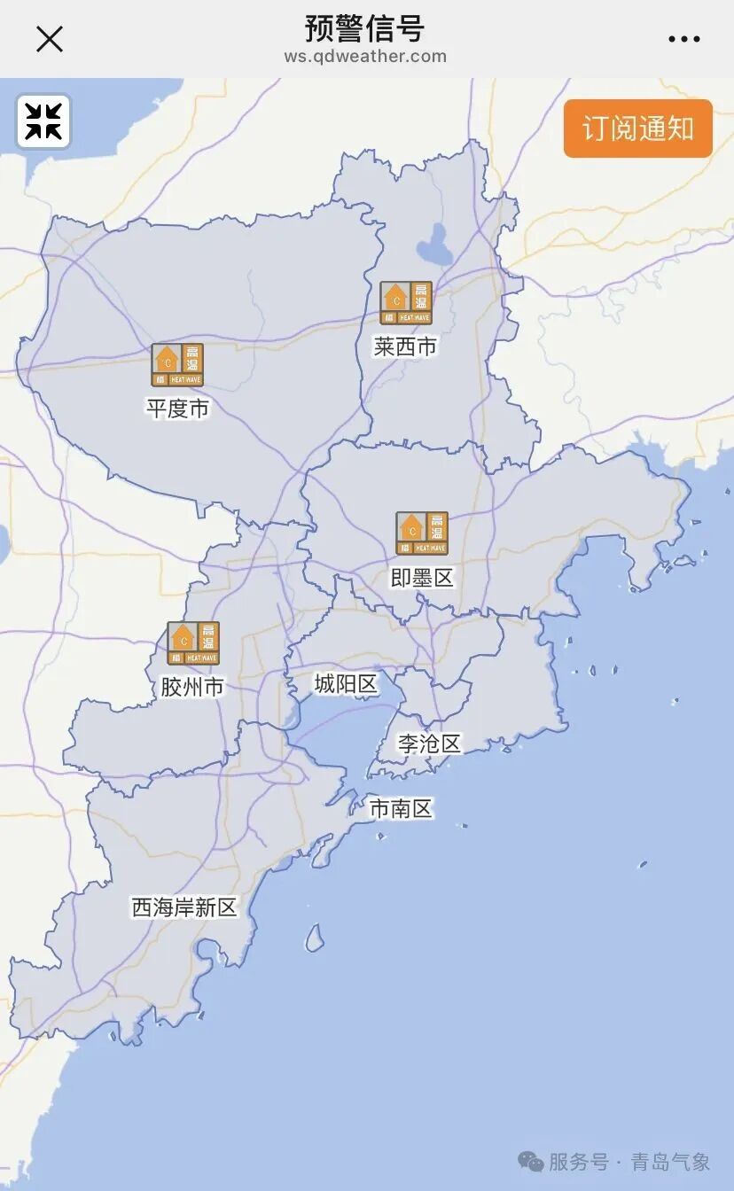 今天白天,岛城晴空当照,炎热升级,中北部地区出现35℃以上高温天气。平度、莱西、胶州、即墨中午时分相继发布高温橙色预警信号。
