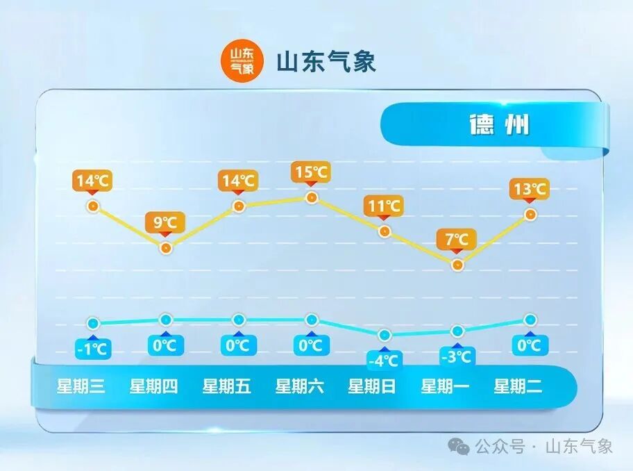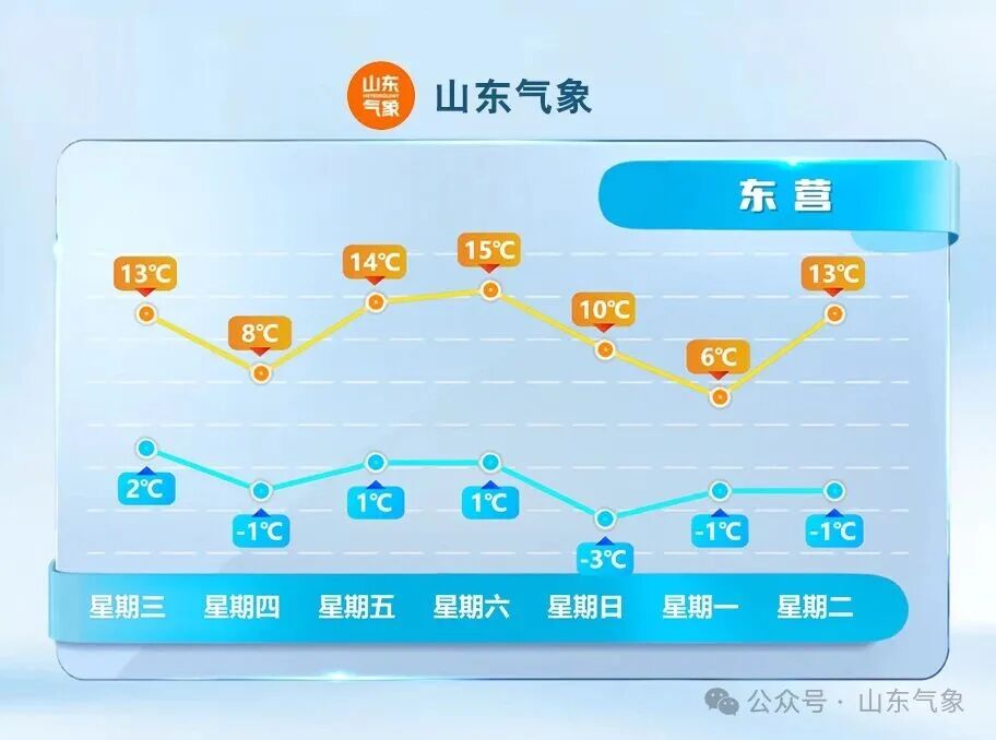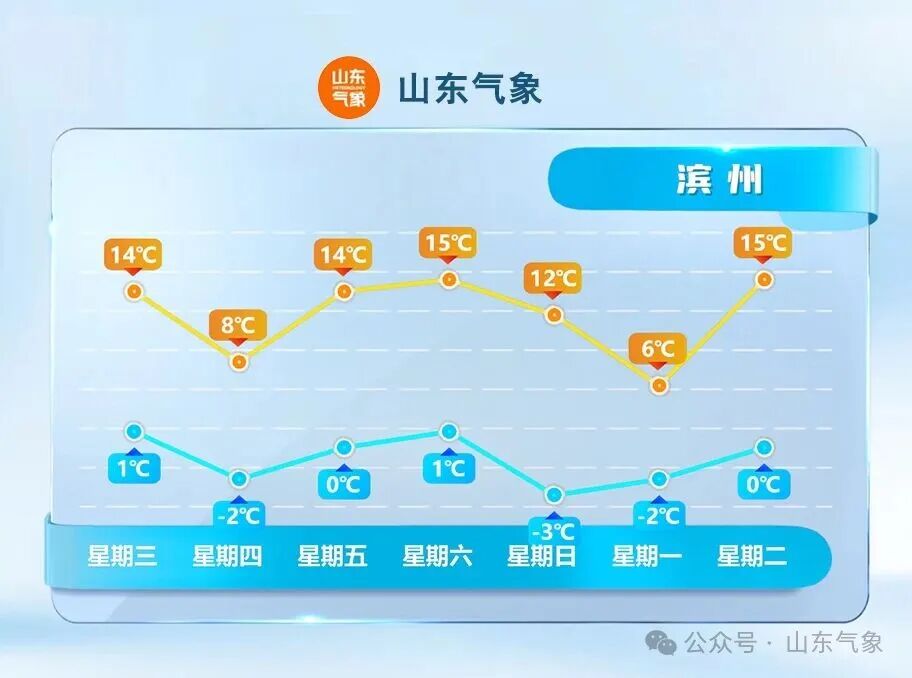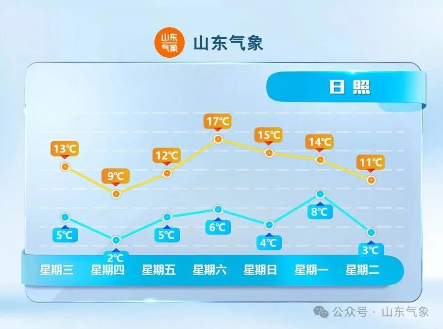 潍坊北部和半岛地区天气阴有小雨雪转晴,其他地区天气晴间多云。东营、潍坊、日照和半岛地区北风5~6级阵风7~8级转南风4级阵风5~6级,其他地区北风4~5级阵风6~7级转南风3~4级。夜间最低气温:滨州、东营、鲁中山区和半岛内陆地区-3~0℃,其他地区1~3℃。最高气温:聊城和菏泽10℃左右,鲁中山区5℃左右,其他地区7℃左右。