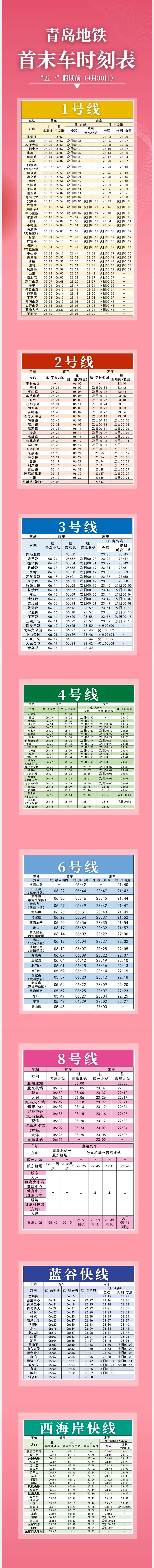 4月30日(假期前一工作日),1、2、3、4号线双向末车,6号线往横云山路、8号线往胶州北站、蓝谷快线往钱谷山、西海岸快线往董家口火车站方向末车均延后1小时;8号线夜间往青岛北站方向23:15、23:45各增开1列直达列车。当日线网各站早间首车时间保持不变。
