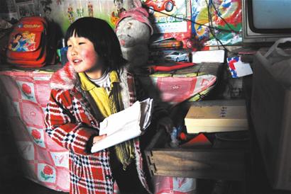 最大心願 不再被鄰家母狗追咬 在知道母親身患絕癥之後,小明嬌仿佛一夜間長大了。也許你很難想象,一個8歲的小女孩,每天一早起來就要開始忙活一天的生計,燒水做飯、收拾家務,然後幫媽媽洗漱,處理媽媽的大小便。因為媽媽身邊離不了人,小明嬌的童年只能在自家小院中度過。每次听到村里孩童嬉笑著跑過家門,小明嬌都會打開院門,伸出頭去觀望良久,無奈地望著小伙伴們遠去的身影。“沒人願 “叔叔,我去搬柴火,你能陪我一起嗎?”正在聊天,小明嬌突然向記者提出一個奇怪的請求,更奇怪的是,母親徐葉芹听到後,臉上現出無比悲傷、無奈的神情。好奇之下,記者跟隨小明嬌來到鄰居家牆外的玉米秸堆。只見小明嬌躡手躡腳地走過去,熟練地將玉米秸堆好,然後拿一根干黃的玉米葉捆起來,拽著比自己還高的玉米秸就跑。任憑記者怎麼喊,小明嬌就是不停下腳步,還不時回頭張望,好像後面有什麼恐怖的東西在追趕她一樣。回家放下玉米秸後,小明嬌才如釋重負地松了一口氣。“我以前去搬玉米秸,有只母狗老是跟著我叫,有時還跑上來咬我,我看著害怕就一路跑回來。”小明嬌嘟著小嘴說,有一次她拽著玉米秸在前面跑,母狗在後面追著咬玉米秸,等回到家的時候,手里的玉米秸已所剩無幾。盡管整天被狗追咬,小明嬌卻從沒敢告訴媽媽,就算被追得跌破手臉,小明嬌回家也是堆滿笑容,不讓媽媽看出一絲異樣。“我最大的心願就是……以後那只大狗不要再追我了,那我就更開心了。”在明嬌眼里,一切磨難都是一場游戲,游戲勝利的獎勵,就是跟媽媽幸福地生活在一起。 惟一安慰 櫥頂三個生日蛋糕盒 搬完玉米秸,小明嬌生火燒上水開始給媽媽洗牛仔褲。雖然已是初春,風中還帶有絲絲寒意,小明嬌用力壓泵打水的身影顯得單薄無力。因為自己不夠高,小明嬌站在凳子上洗衣服,牛仔褲布質很硬,小明嬌只能弓著腰、咬著牙,用小手一點點地將水分擠干。洗完衣服,冰冷的地下水已將一雙小手凍得通紅,但小明嬌臉上還是堆滿微笑。 “明嬌每天洗衣服累不累?”記者問道。“不累!”小明嬌笑著告訴記者,她有自己的“快樂法寶”,每次干活累的時候,她就會看看 “快樂法寶”,然後繼續開心起來。順著小明嬌的視線,記者找到了堆在衣櫥上面的3個生日蛋糕盒。這3個生日蛋糕盒已落滿灰塵,有個都破舊裂紋了,但小明嬌一直不舍得扔掉,每次看到它們,小明嬌就仿佛又過了一次生日般的快樂。也許這些髒盒子在別人看來是些垃圾,但在她眼中,它們都是她的寶貝,她微笑的源泉,她最大的安慰,煩了、累了、哭了,小明嬌就會蹲在衣櫥下面,盯著生日蛋糕盒良久不動。 在別人看來,7歲的孩子僅過了三次生日是可悲的,而小明嬌卻驚人地樂觀,“我都過了3個生日了,吃了三次蛋糕。”盡管小明嬌已記不得這3個生日是什麼時候過的,但媽媽臉上那難得的笑容卻印在了她的腦海中。 |
