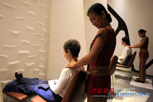 5月1日,上海世博會菲律賓館開館,其館內設置的傳統按摩深受參觀者歡迎,一早便預約完畢。中新社發 潘索菲 攝