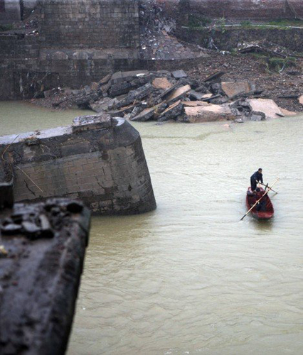 ![]() 5月15日,一位居民在斷橋的殘垣旁清理雜物。新華社記者 趙眾志 攝