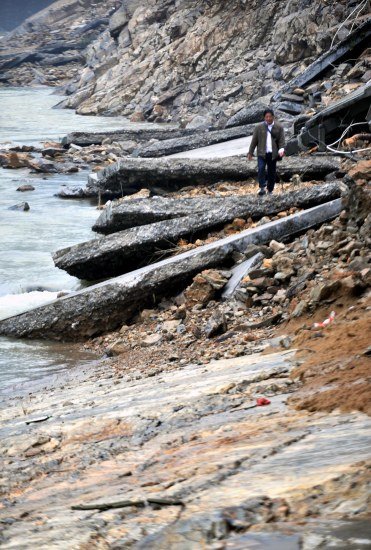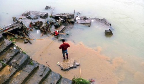 5月12日至5月13日,湖南省漵浦縣境內普降大到暴雨,引發山洪 5月13日下午,一場百年不遇的特大山洪沖毀了漵浦縣善溪鄉通往縣城的咽喉要道善溪大橋。善溪鄉通往鄰近新化、安化縣的公路也被洪水沖斷。善溪鄉境內公路全部中斷,水利、電力、通訊等基礎設施損毀極其嚴重。 湖南漵浦縣暴雨引發山洪致8000余人被困在善溪鄉政府所在地一心村,村民劉登池告訴記者,5月13日山洪爆發時,善溪江水位在不到一小時內猛漲10多米,洪水一度漲至沿河兩岸民居二樓,街道上最深水淹處深2.7米。 突如其來的洪水使善溪鄉8000多名群眾生活面臨嚴峻困境。臨河的農貿市場已空空蕩蕩,鎮上四家糧油店也全部被沖毀。在農貿市場旁做糧油生意的商戶劉智勇說,洪水將他家店里存儲的3000多斤大米全部沖走,店里現在只剩下不到10斤大米,另外三家糧油店的存貨也被沖走,現在全鎮無米、油可買。 據善溪鄉鄉長何石光介紹,善溪鄉是漵浦縣最邊遠的鄉鎮之一,目前許多村民家中已無米下炊。此外,由于善溪鄉政府所在地一心村村民飲水全部是通過善溪大橋從對岸的安化縣渠江鎮引水供應,大橋被沖斷後,鎮上有800多人面臨斷水。 另據記者了解,5月15日上午,經過一晝夜的搶修,一條經過鄰縣安化境內連接漵浦縣城和善溪的臨時通道被打通。15日上午,第一批1萬斤大米、200多床棉被的救災物資已通過鐵索橋人工運到了善溪災區。但16日至18日,災區又將迎來新一輪強降雨,臨時打通的道路隨時有可能再次中斷。(記者 譚劍) ![]() 5月15日,一位居民從被洪水沖垮的公路塌方處走過。新華社記者 趙眾志 攝