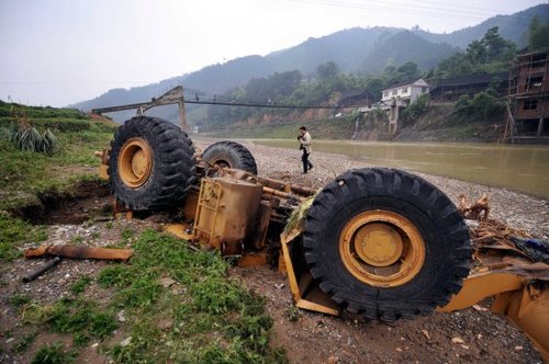 ![]() 5月15日,一輛被山洪沖擊翻倒而深陷污泥中的鏟車。新華社記者 趙眾志 攝