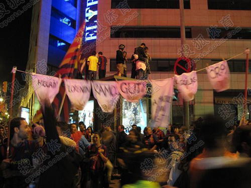 ![]() 和以往一樣,在巴薩奪冠之後,球迷們自發地聚集到了Canaleta廣場慶祝,但這次規模顯然要大了許多,並且加泰羅尼亞廣場架起了大屏幕,可以供球迷觀看現場直播,當晚這里也是聚集了數千人前來慶祝,而據統計當晚在街道上慶祝的巴薩球迷共計可達到四萬多人! 巴薩球迷們在瘋狂慶祝的同時自然沒有忘記貶低和侮辱他們的死敵皇馬,其中最具創意的當屬兩位球迷用內褲寫上皇馬球星和主席的名字,做了個大的橫幅,並當街巡展。C羅、卡西利亞斯、古蒂、拉莫斯、伊瓜因等皇馬球星個個榜上有名;而且最惡搞的是,內褲的底部還都是髒兮兮的,就好像嬰兒經常把屎尿都拉在內褲上一樣,讓人忍俊不禁。同時再配上那句經典的“Madrid,cabron,saluda al campeon!”“皇馬,王八蛋,向冠軍致敬!”,此景象光听描述就可以想象有多“惡毒”。此外,還有球迷爬到了報亭上、樹上、雕像上,他們盡情地歡呼著、盡情地享受著這個難忘的夜晚! 另外,廣場大屏幕一直都在互動直播,並且現場還有樂隊演出。同時競爭下任主席的費雷爾,也借機拉起人氣,他的競選智囊團還組織搭起了人塔。就在廣場人叢當中,一位球迷高舉著一個自制的牌子,寫著“Real Madrid,Game Over。弗洛倫蒂諾,繼續投錢!”狂貶皇馬之心人皆可知! 當然,當晚最忙碌的自然要數加泰羅尼亞的警察們,他們個個神經緊繃,完全無法、也根本沒有時間去為自己心愛的紅藍軍團過多去慶祝、歡呼、宣泄。因為他們今晚的首要任務就是保證慶祝人群的生命安全,以及廣場周邊公共設施的健全。由于每次在Canaletas慶祝的時候,都有少數球迷破壞公物或者非法燃放爆竹。這次也不例外,少數球迷在下半夜12點30分左右的時候開始有過激的行為,他們開始砸電話亭、燒垃圾桶,甚至是砸商店的櫥窗,開始警察們僅僅是喊話勸阻,但到最後由于事件升級,他們不得不開始逮捕激進的球迷,並逐漸驅散人群。而這些少數的激進球迷則向警察擲石塊、酒瓶,甚至和警察發生了“巷戰”,最終共有104個球迷被逮捕。隨著直播的結束,廣場的球迷也開始慢慢散去,但他們一路上高唱的巴薩隊歌卻久久不曾飄遠。 |