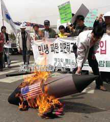 一些韩国示威者在韩国国防部门前焚烧美制武装直升机模型,以抗议美国政府向韩国出售武器。他们认为,美向韩出售武器将损害朝鲜半岛的统一进程。