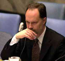 5月3日,联合国经济及社会理事会举行会议,对该理事会下属各机构的成员国进行改选。美国在联合国人权委员会的改选中落选。图为美国驻联合国代理大使詹姆斯·坎宁安在当天联合国安理会的会议上面无表情地听着别人的发言。