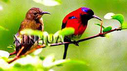 我国第一个太阳鸟馆近日在昆明市滇池之畔建成开放。600余平方米的太阳鸟馆放养着300多只来自云南省文山、红河和西双版纳丛林的太阳鸟以及黑头金翅等20多种鸣禽。该馆的建成,既为鸟类专家研这一小型鸟种提供了基地,同时也给昆明增添了一个新的旅游景观。 太阳鸟小巧玲珑,为珍稀名贵的小型观赏鸟。图左为雌鸟,毛羽呈灰色;右为雄鸟,火红的羽毛似太阳般璀灿艳丽 。