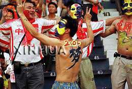 在世界杯亚洲区外围赛小组赛中,中国国家足球队主场以3:1战胜柬埔寨队。尽管中国队表现不能令人满意,仍有很多球迷在赛场为国家队呐喊助威。图为球迷在为中国队呐喊。